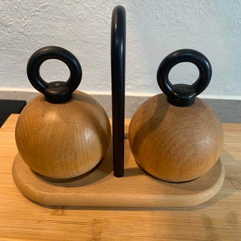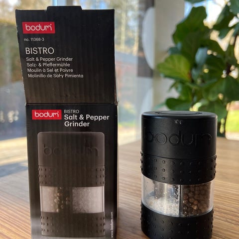 Handy 2-i-1 salt- og peberkværn fra Bodum i velholdt stand. Højde 11,2 cm, bredde 6,8 cm. Formalingsgraden kan justeres i bunden af kværnen. Foroven fremgår det, at drejer man til den ene side, kværner man salt, og drejer man til den anden side, kværner man peber. Silikonebåndet omkring toppen gør kværnen ergonomisk god at holde om. Fast pris. Afhentning i Aarhus C eller forsendelse for købers regning.