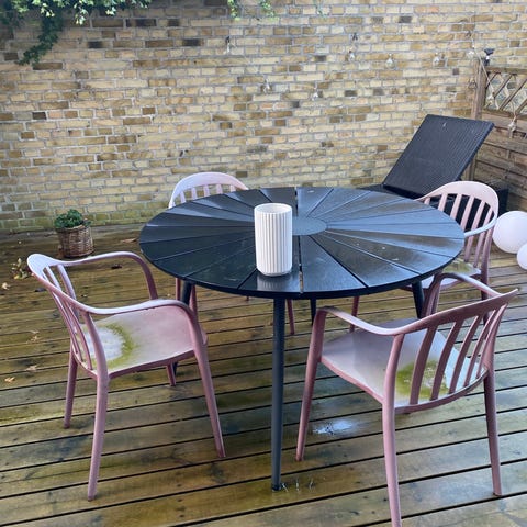 Udendørs møbelsæt bestående af et rundt bord og 2 stole.