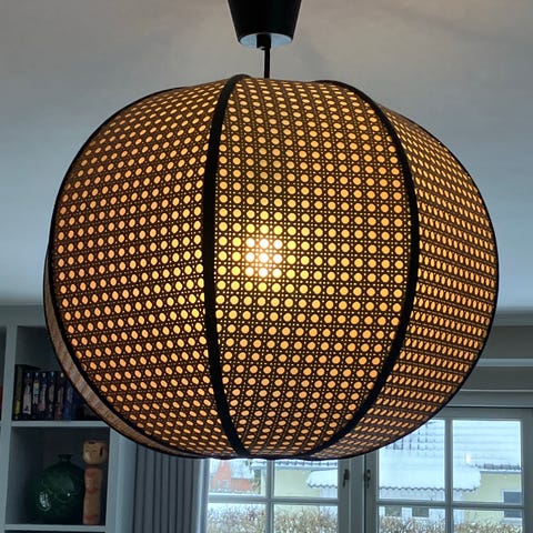 Den er i farven messing med 6 udtag til pære. Man kan selv sætte den som man lyster.