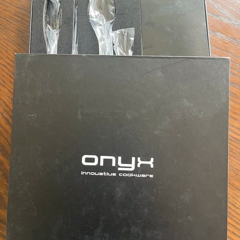Et sæt helt nyt onyx steakbestik som aldrig er blevet taget i brug.