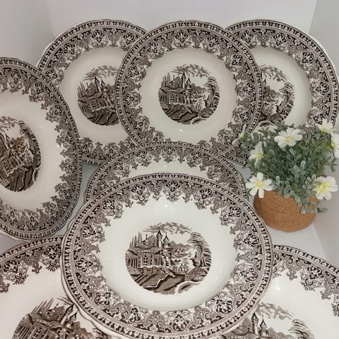 dette sæt er velegnet til servering af italienske risretter, spaghetti osv. 1 tallerken har lille bitte afslag på kant. ital ipskrifter i bund af tallerken.