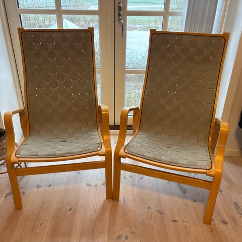 To højryggede lænestole samt skammel i tidløst skandinavisk design. Stellet er af forspændt bøg. Sæde og ryg er gjorde af hør i farven beige og alt sammen intakt.
