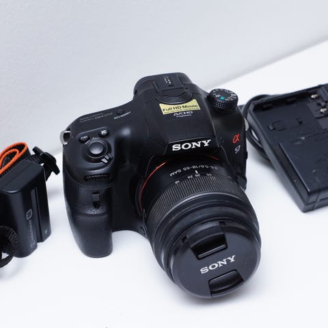 Sony A55 kamera med vippe og roterende skærm. Optager FHD video. God billedkvalitet samt videoer. Lys stærkt skærm. påmonteret et lysstærkt 18-70 objektiv med et meget hurtigt fokus. Skærmen er lidt misfarvet ren kosmetisk) har ikke indflydelse til funktionalitet. Skærmen hat beskyttelsesfolie på som holder ikke i længden, kan udskiftes hvis man ønsker det ( har selv gjort det på min A7s ( viser på sidste billede) resten af kameraet ser som nyt ud. Kameraet fungerer som skal. Komplet g klar til brug. Sættet består af: