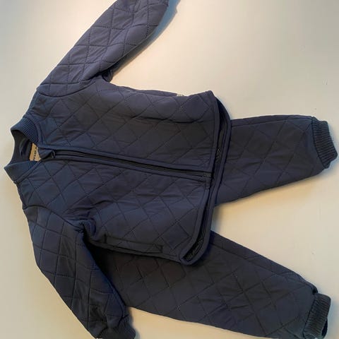 Sættet er i grøn farve og består af en quiltet jakke med lynlås og ribkant ved ærmerne samt matchende bukser med elastik i taljen. Materialet er designet til at holde barnet varmt i koldt vejr.