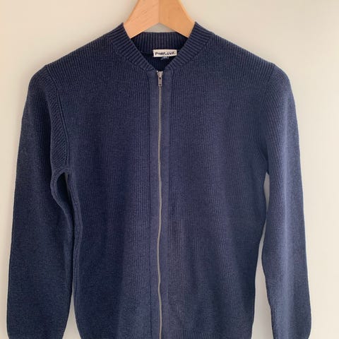 Cardigan, ULD OG BOMULD, POMP de Lux, str. 104, Lækker cardigan str. 104. Lysegrå og mørkegrå med carrygul stribe nederst på ærme og trøjekant.