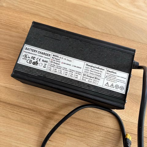 Batterioplader med output på 84V og 10A. Farve sort, udstyret med ventilator til køling og standard stik til tilslutning. Designet til opladning af elcykel batterier med passende spænding og strømstyrke.