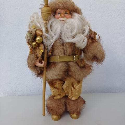 Vintage trænisse eller julemand med finurligt udtryk og klassisk nissetøj.