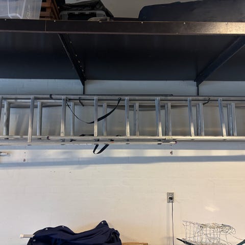 Sæt bestående af tre stiger i forskellige størrelser. To af stigerne er lavet af træ med flere trin og viser tegn på brug med afskallet maling. Den tredje er en mindre aluminiumsstige med to trin og blå sikkerhedsbånd. Stigerne kan anvendes til forskellige formål inden for byggeri, vedligeholdelse og andre opgaver, der kræver adgang til højder.