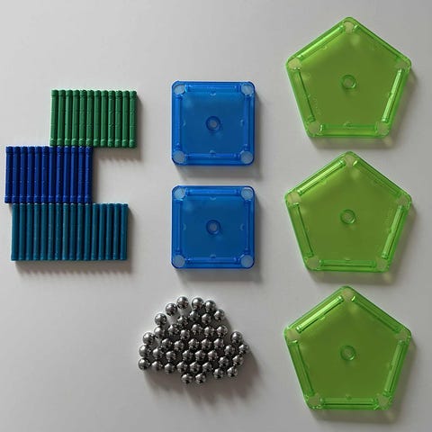 Antal dele: 118 (24x trekanter, 34x firkanter, 36x stave, 24x magnetkugler).