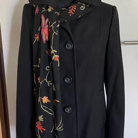 Her tilbydes en skøn ensfarvet grøn frakke, med mønster i stoffet (se nærfoto), fra United Colors of Benetton, str 38.
