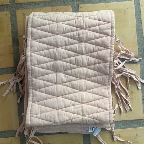 Sengeranden har quiltet mønster og snore til fastgørelse. De sidste to billeder er fra deres hjemmeside, af samme sengerand men i en anden farve.