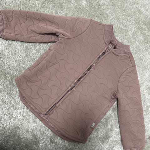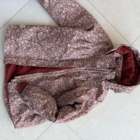 Jakken har hætte, elastiske ærmekanter og gennemgående lynlås, samt knaplukning foran.
