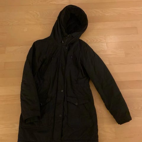 Elvine Vinterjakke til kvinder i størrelse S. Jakken er blå og designet til vinterbrug med en hætte og lynlås. Den har lommer foran og en justerbar snor i taljen for tilpasning. Inderlæggens mønster er i kontrastfarve.
