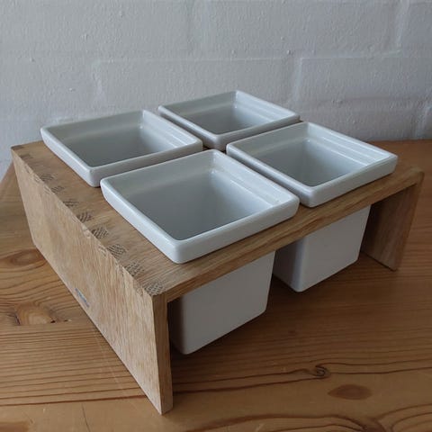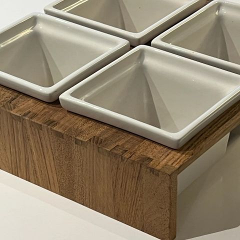 Flot teak-ramme med 4 hvide keramikskåle. Kan bruges til snacks, krydderurter, blomster, juledekoration eller diverse småting. Kun fantasien sætter grænser.