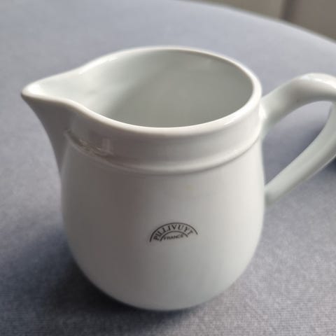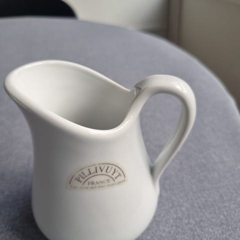 2 fine hvide mælkekander - 12 cm fra bunden til tud. Henholdsvis 6 og 8 cm brede. Den lille:75 kr. Den store:100 kr. Samlet: 150 kr
