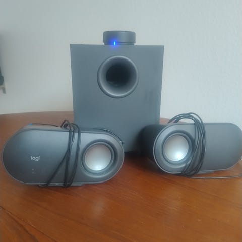 Et mindre Logitech PC højtaler sæt bestående af to små højtalere og en subwoofer. En skramme på wooferen og stoffet er revet i stykker. Betyder intet for funktionalitet. Spiller ok højt og er kablet med en volumen knap. Se billede.