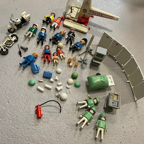 Playmobil legetøjssæt hospital bestående af diverse figurer og tilbehør, herunder personer, medicinsk udstyr, møbler og små rekvisitter. Farverne inkluderer primært grøn, hvid og beige. Materialet er plastik. Sættet indeholder elementer som hospitalsseng, medicinsk vogn, og forskellige små dele til rollespil.