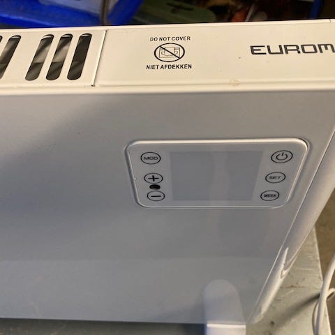 Eurom elektrisk radiator med en effekt på 1500 watt, hvid farve og monteret på hjul for nem mobilitet. Radiatoren har flere varmeindstillinger og er designet til opvarmning af mindre til mellemstore rum.