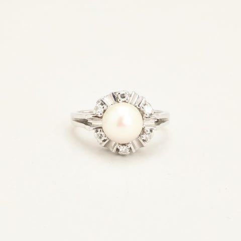Perle ring i 18K hvidguld med diamanter (0.16 ct) og én