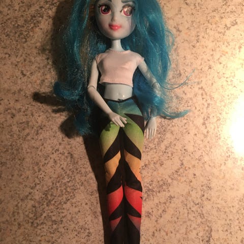 Dukken er ny med monster high kjole på. Rainbow high sko samt leggings og trøje plus smykker.