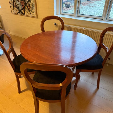 Rundt spisebord i massivt træ + Flotte moderne spisestole