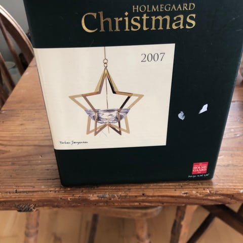 Holmegaard lyslygte- til fyrfadslys - fra 2013. Motiv - slædehund med gaver på slæden design Jette Fröhlich. Højde 7,5cm og diameter 6cm. Fin og hel. Pris kr 45