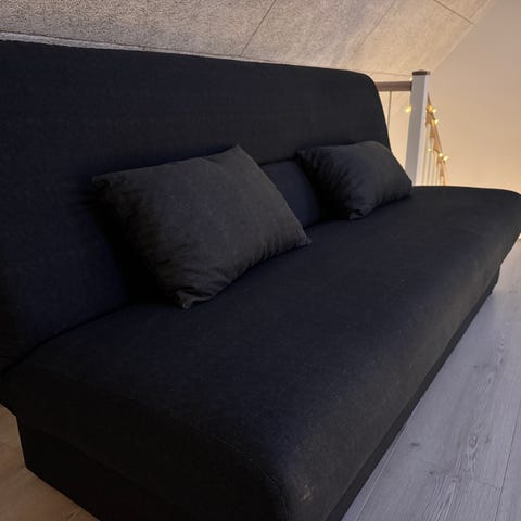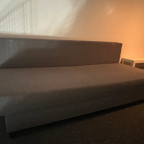 Super fin sovesofa i mørk grå, med opbevaring nedenunder til sengetøj.