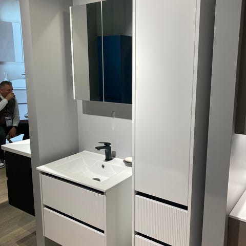 100 cm. badmøbel - badeværelses møbel med mat blå lakeret fronter og frisider. Alle skuffer og låger med softclose. - pris ekskl. spejl-armatur, skuffeindsatse og andet tilbehør - kan dog tilkøbes. Skabe samlet og er beregnet til at hænge på ophængsbeslag.. Ekstra skabe og højskab kan tilkøbes. Kig på vores andre annoncer… søgeord - badmøbel-badeværelse-bad-bad inventar-badvask-badeværelses vask-badmøbel, badeværelses udstilling i kolding. Altid klar med et godt tilbud på billigt badmøbel. Mange badeværelses skabe på lager.