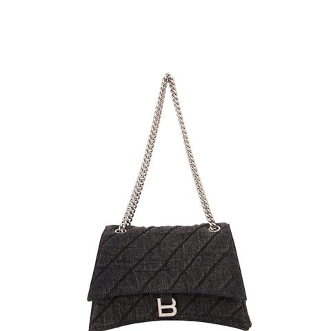 En moderne klassiker fra Balenciaga, der kombinerer husets ikoniske Hourglass-silhuet med et edgy, metallisk udtryk. Denne Balenciaga Crush i cracked metallic silver læder udstråler attitude og luksus. Tasken har en struktureret form, kædestrop i sølv og det karakteristiske “B”-logo foran – et tydeligt Balenciaga-statement. Perfekt til aftener ude eller som et cool supplement til hverdagslooket.