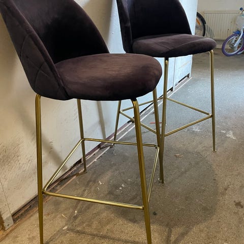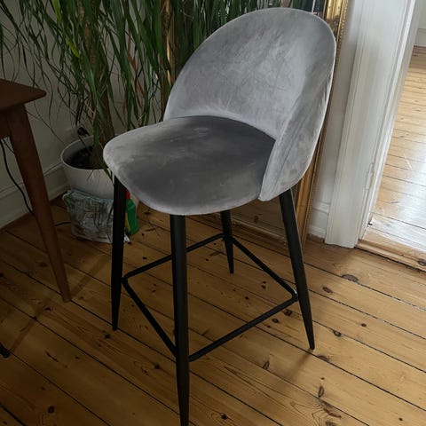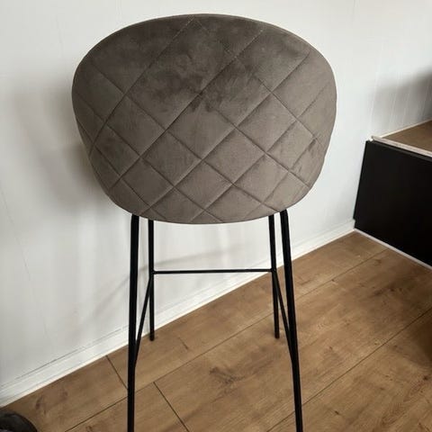 2 GRINDSTED barstole fra Jysk i grå velour. De har desværre nogle pletter + en lille blå plet, men ellers i rigtig fin stand.