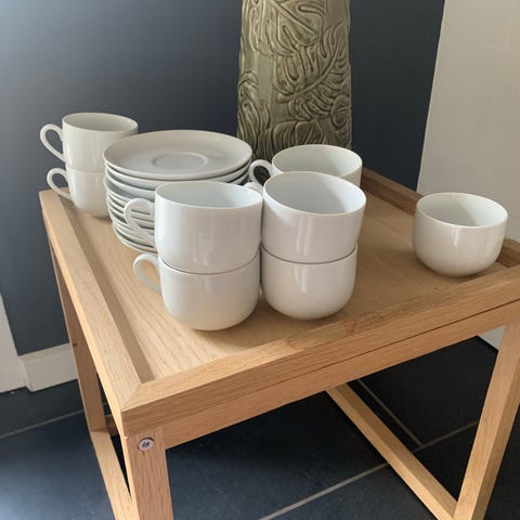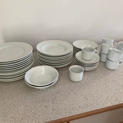 Studio. Hvidt stel bestående af 20 kopper, 23 underkopper og 27 kagetallerkner. Nogle kopper/tallerkner er Studio. Andre har ingen mærke, men ser ud som Studio. I alt 70 dele. Prisen svarer til ca 5kr pr. del. Stellet har været brugt som ekstrasæt, derfor ikke brugt særlig meget. Sælges samlet.