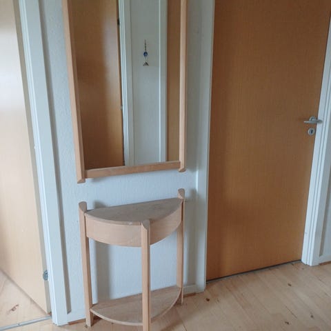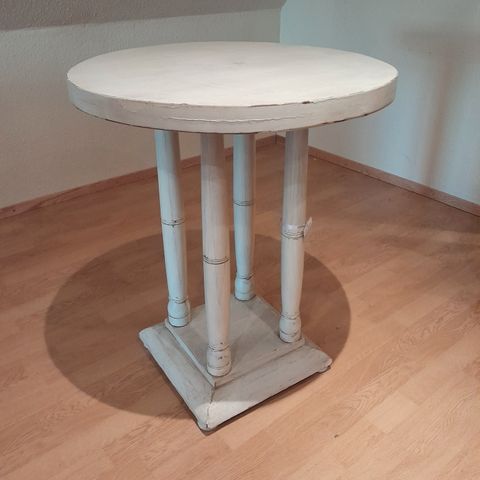 Ilva halvrund konsolbord i træ med dekorative ornamenter. Bordet har en hvidmalet finish med et let slidt look, hvilket giver det et vintage præg. Det har to ben og en flad bagside, der gør det velegnet til placering mod en væg. Egnet til brug som entrébord eller dekorativt møbel i forskellige rum.