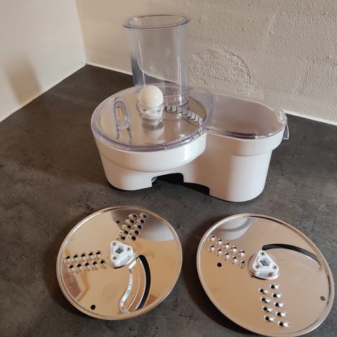 Medfølger 4 forskellige tromler der kan klare skrivning og grov og fint rivning af bl.a. grøntsager og rodfrugter. Fremstår med brugsspor