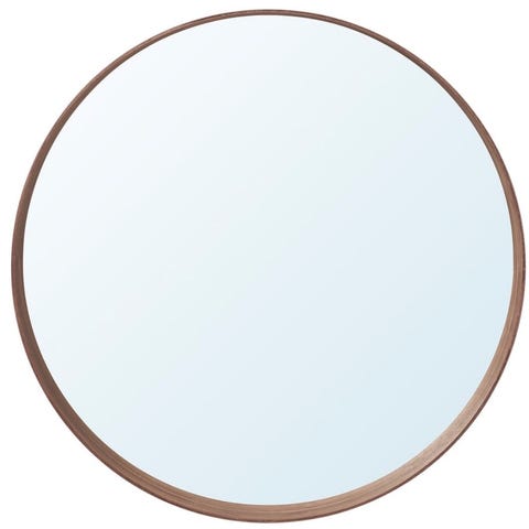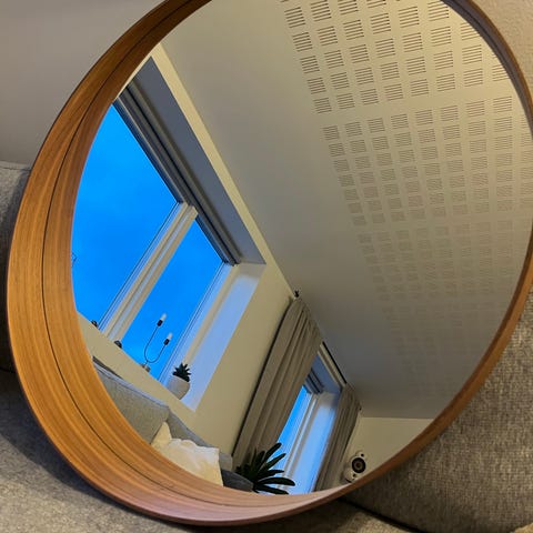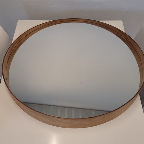 IKEA rundt spejl med træramme. Designet af Ola Wihlborg. Spejlet har et enkelt og funktionelt design med en naturlig træramme med hvid kant, der passer til forskellige indretningstilarter. Velegnet til ophængning på væggen. Beklædning (safety film) på bagsiden som forhindrer at glasset splintrer, hvis det går i stykker. (Nypris 260 kr.)