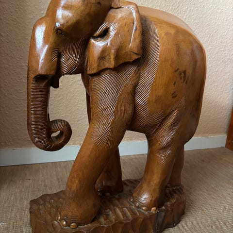 Sæt bestående af tre træfigurer formet som elefanter i forskellige størrelser. Fremstillet af naturfarvet træ med detaljeret udskæring. Velegnet som dekorative genstande til hjem eller kontor.