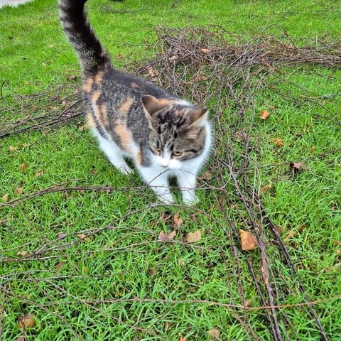 Æder tørfoder og får vådfoder en gang om dagen. Er vant til at gå ude da vi bor på en gård.