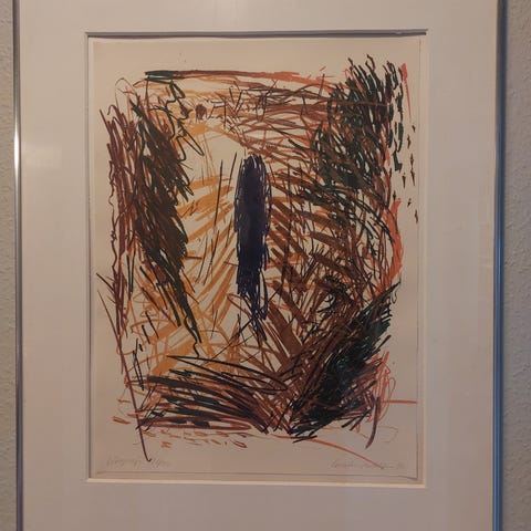 Originalt farvelitografi af Carsten Rudolfsen (f. 1950), en del af den fynske grafiske skole. Værket er signeret og dateret ’93 samt nummereret 109/135. Et farvestærkt og ekspressivt motiv med dynamiske penselstrøg og lag af grønne, blå og orange toner.