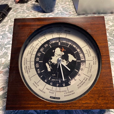 Seiko bordur. Messing farvet i pæn stand. Går præcist. Højde 27 cm. " Pynten" under urskiven drejer ikke altid rundt. Ved ikke om det er en fejl.