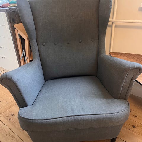 Sælger min lænestol for at gøre plads til en sofa til min kæreste og jeg. Har ikke brugt den meget da jeg hverken ser TV eller læser. Kun til de små gruble stunder. :)