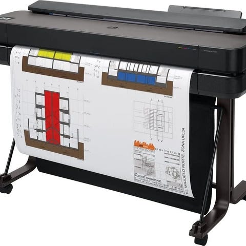 HP DesignJet T650 plotter med tilbehør. Plotteren er designet til professionel brug og har funktioner til storformatprint. Produktet fremstår med tilbehør som vist på billederne.