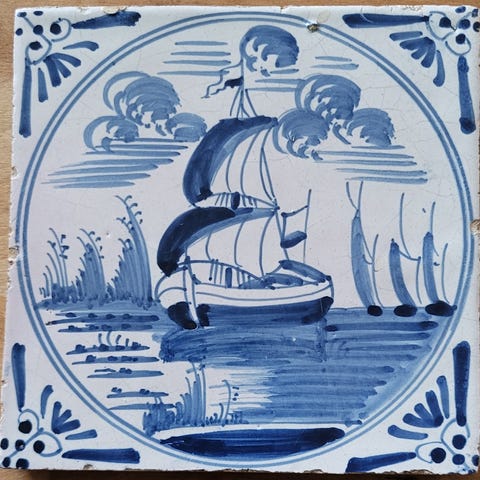 Sæt bestående af 7 håndmalede Delfts Blå fliseplader med forskellige motiver, herunder vindmølle, sejlskib, mand med guitar og andre traditionelle hollandske motiver. Fliserne har blå dekorative hjørner og er lavet af keramik. Velegnet til dekorative formål eller som samlerobjekt.