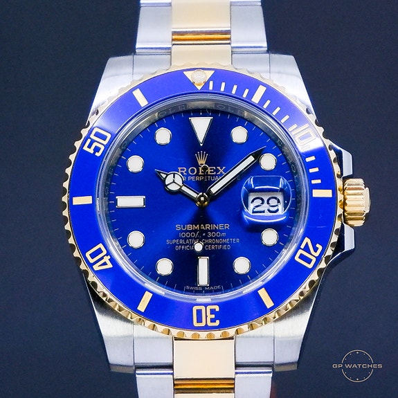 En yderst sjælden og ikke mindst charmerende Omega Speedmasterreduced tripple date i guld stål. Uret har ikke været brugt og fremstår derfor i rigtig flot stand. kommer med boks og papirer. En rigtig flot kombination af guld og den dybe blå skive.
