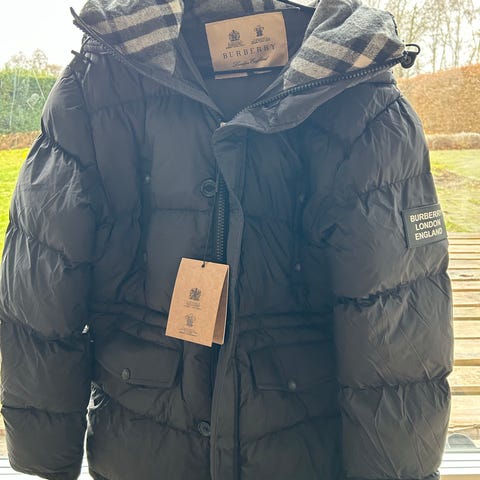 Burberry Vinterjakke i sort farve, størrelse S til herre. Jakken er designet til udendørs brug i vinterperioden og har en polstret konstruktion for ekstra varme. Den har en hætte og lynlåslommer, samt Burberry-logo på ærmet og indvendige mærker med brandnavn.