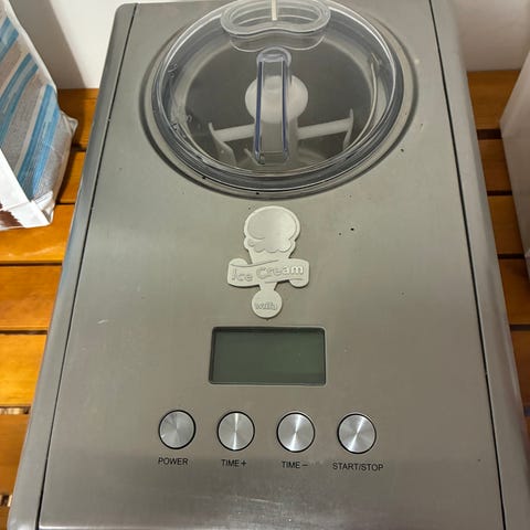 Wilfa ismaskine i rød plast med gennemsigtigt låg. Maskinen har en elektrisk tilslutning og en kapacitet til at lave hjemmelavet is. Designet er kompakt og velegnet til brug i hjemmet.