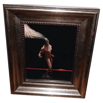 Akryl og oliemaleri af nøgen mand i bred sølvramme fra 2010.