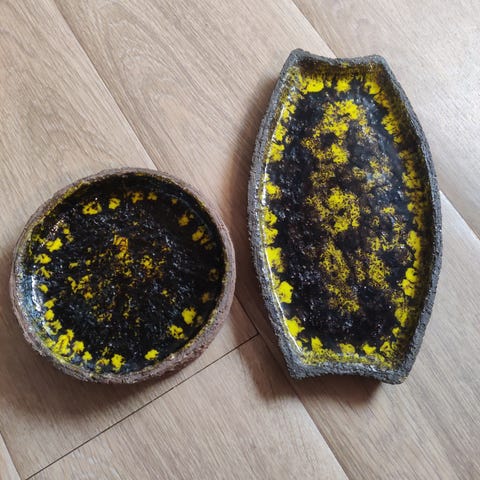 Terracottafarvet fad og Bordlampe med Reliefdekoration