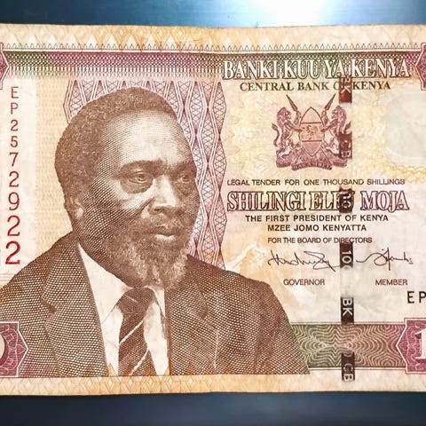 Kenya Central Bank 10 og 20 Shillings seddel sæt bestående af to 10 Shillings og to 20 Shillings sedler. Sedlerne har forskellige design med portrætter og kulturelle motiver. Materialet er papir, og sedlerne er brugt og viser tegn på slid.