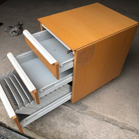 Incl nøgle og med skuffer og en til hængemapper. Birk eller ahorn finér, svært at se forskel