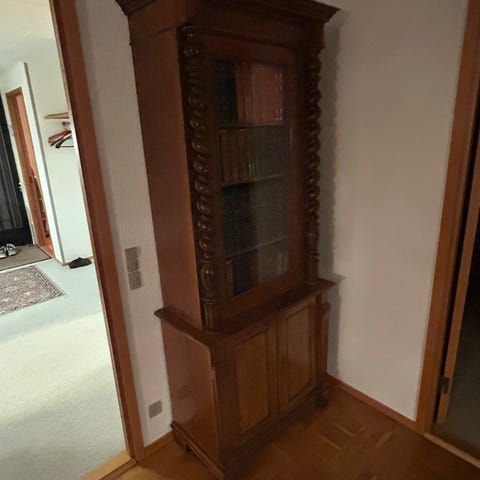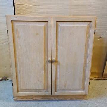 Skabet er lavet af lyst træ med glaslåge og hylder. Det har et enkelt og tidløst design. Designet af Tom Stepp til den store danske encyklopædi. Uden det i skabet udstillede. ,Afhentes i:,Røde Kors Ølby/Køge (259),Bemærk at mail, chat og beskeder ikke besvares, og varen skal købes på knappen "Gå til varen"