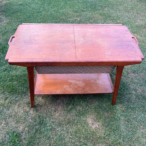 Entre møbel/sybord i eg med en skuffe og underhylde. Det har runde drejede ben. Træets overflade er glat og naturlig, hvilket fremhæver struktur og farve. ,Afhentes i:,Røde Kors Ølby/Køge (259),Bemærk at mail, chat og beskeder ikke besvares, og varen skal købes på knappen "Gå til varen"